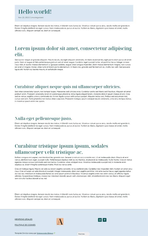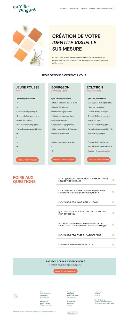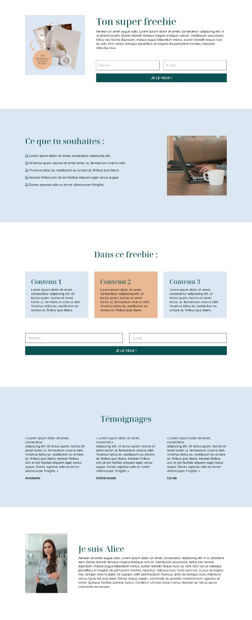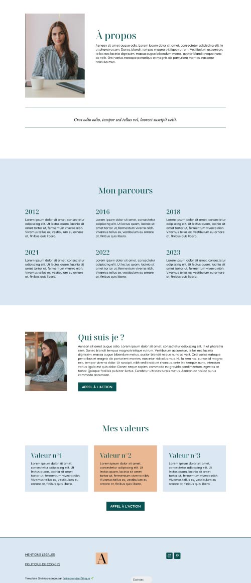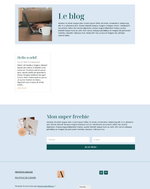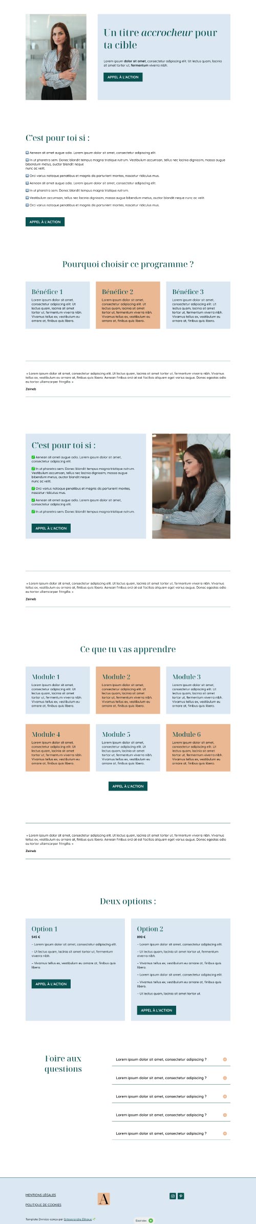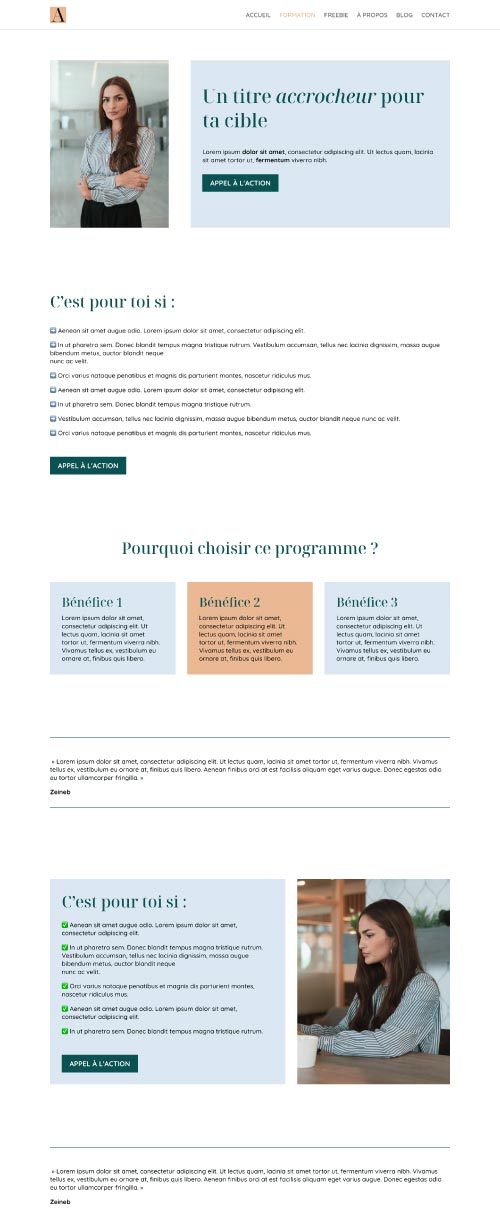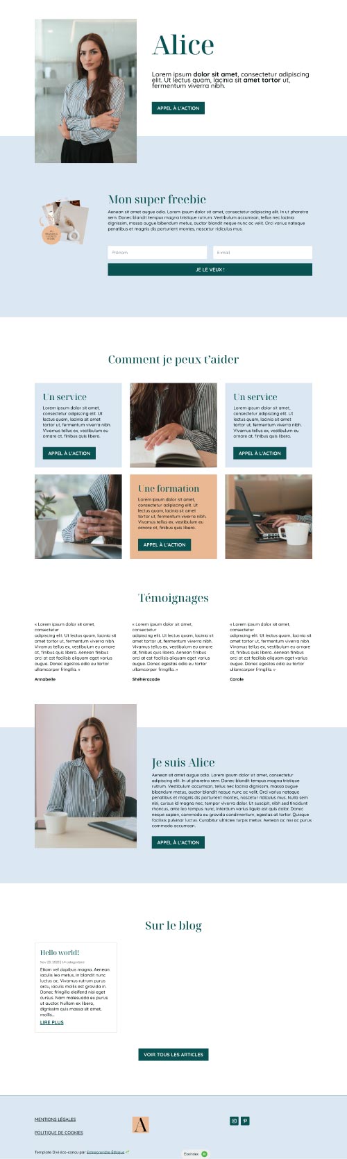Un template de site web pour les prestataires de services : coach, formatrices, rédactrices web, assistante virtuelle, bras droit, ... Idéale si : tu proposes un freebie et/ou de la formation en ligne.